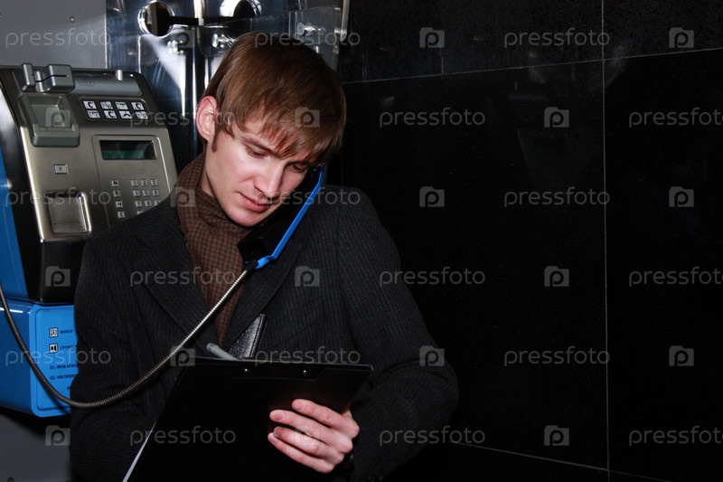 Молодой человек разговаривает по таксофону