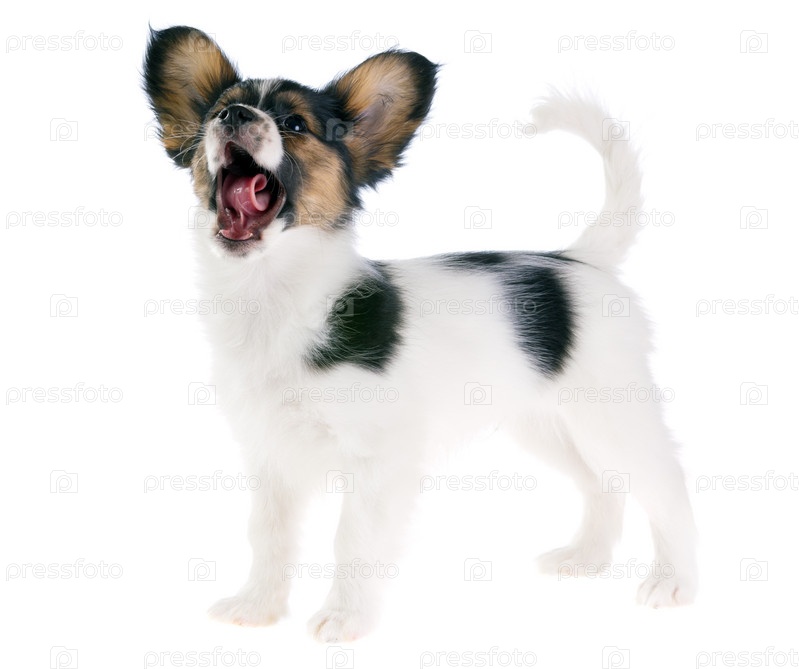 Щенок папильона зевает на белом фоне