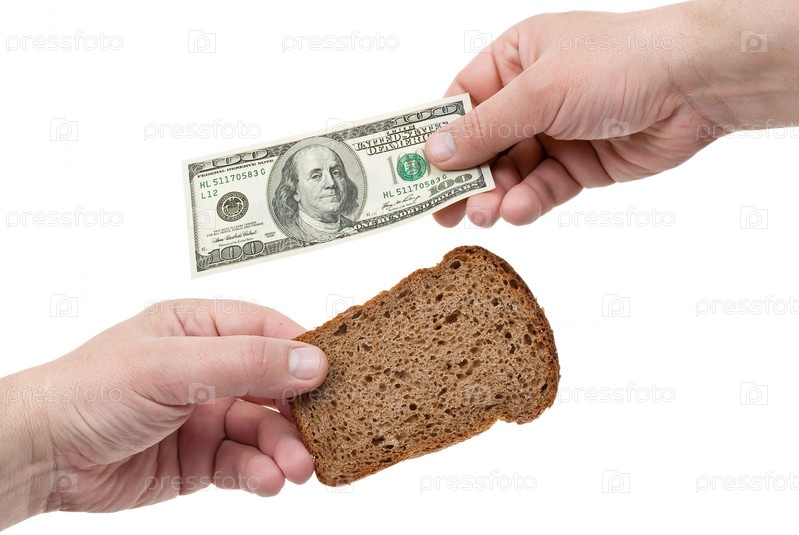 Кусок ржаного хлеба и доллар в руках людей на белом фоне