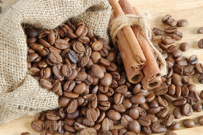 Кофейные бобы и палочки с корицей в холстовом мешке на деревянном фоне