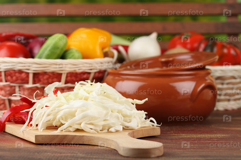 Нарезанные овощи на кухонной доске, целые овощи в корзине и глиняный горшок на столе