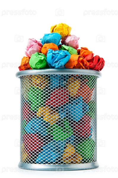 Полная мусорная корзина с комками цветной бумаги на белом фоне