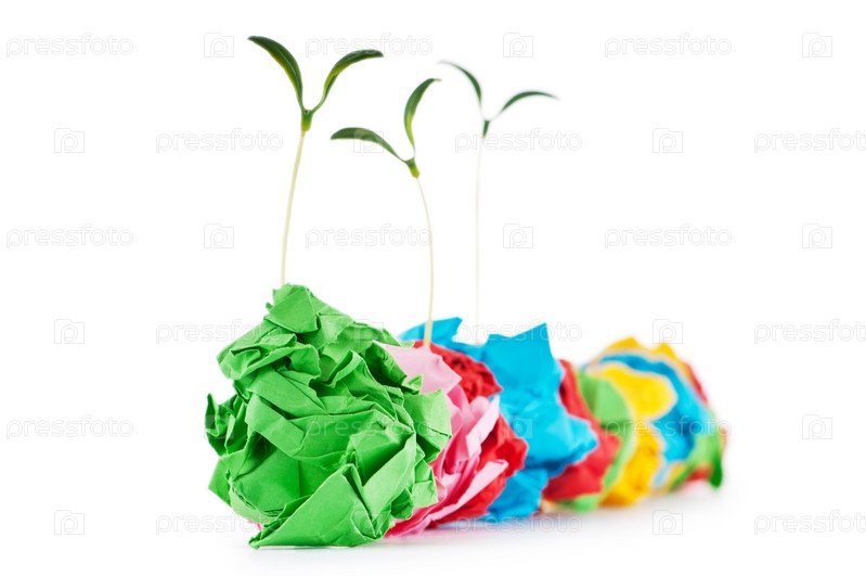 Зеленые ростки пробиваются из цветной макулатуры на белом фоне