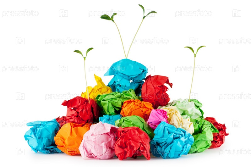 Зеленые ростки пробиваются из цветной макулатуры на белом фоне