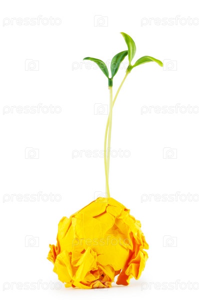 Зеленые саженцы пробиваются из комка желтой бумаги на белом фоне