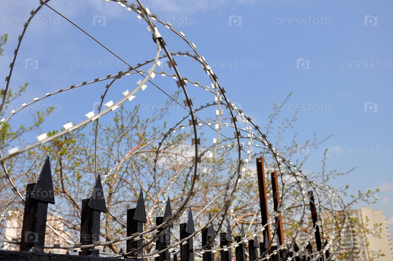 Колючая проволока на заборе в тюрьме