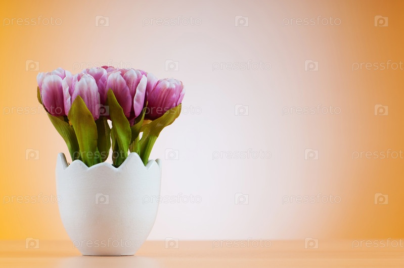 Фиолетовые тюльпаны в белом горшке на светло-коричневом фоне