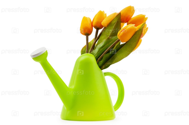 Желтые тюльпаны в зеленой лейке на белом фоне