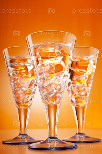 Три стеклянных бокала с водой на светло-коричневом фоне