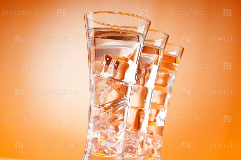 Три стакана с водой и льдом на светло-коричневом фоне