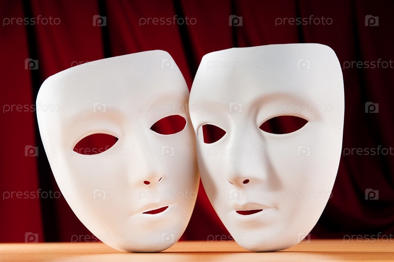 Две белые маски на фоне красного занавеса