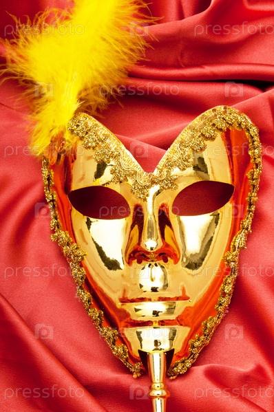 Желтая позолоченная карнавальная маска на красной шелковой ткани