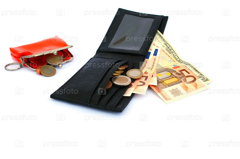 Деньги в евровалюте в двух бумажниках на белом фоне