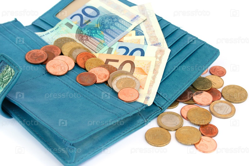 Деньги в евровалюте в синем бумажнике на белом фоне