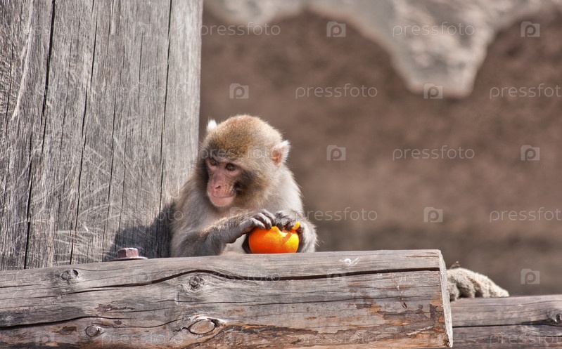 Макака в вольере с апельсином в руках