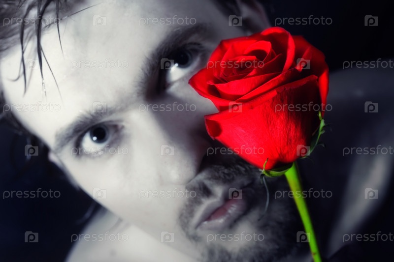 Молодой человек с красной розой на черном фоне