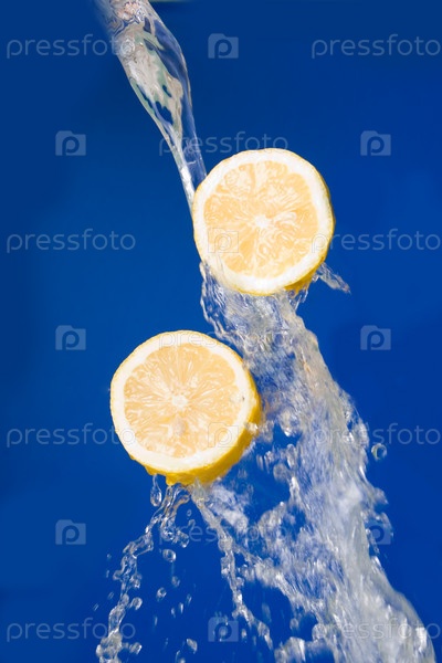 Две половинки лимона в брызгах воды, на синем фоне