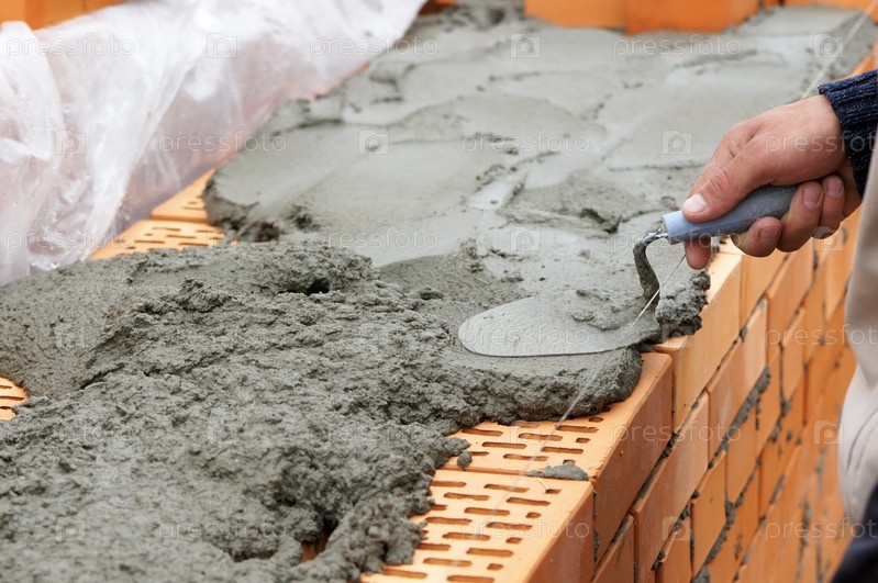 Каменщик строит стену из кирпича