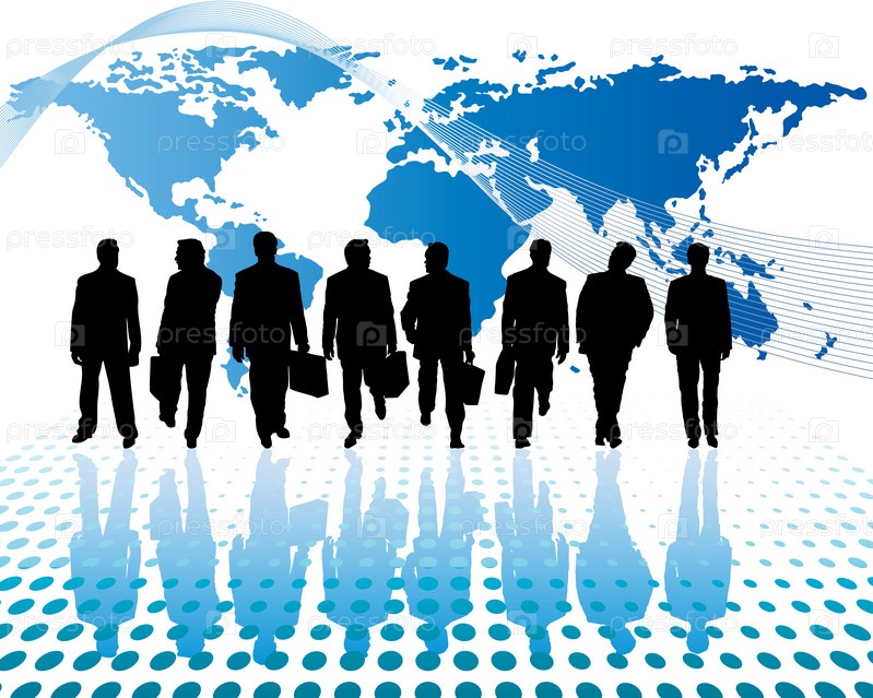 Силуэты бизнес-людей на фоне карты мира