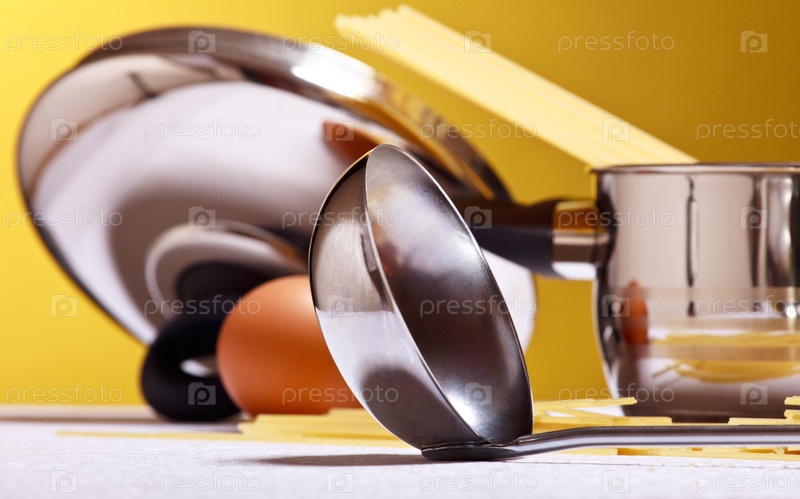 Кастрюля со спагетти, яйцо и половник на кухонном столе