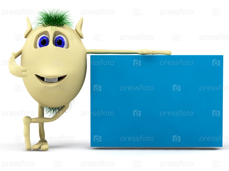 Кукольный персонаж стоит возле пустой синей афиши на белом фоне