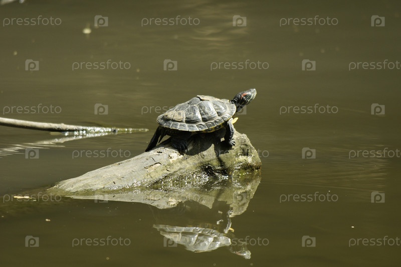 Черепаха на бревне посреди пруда