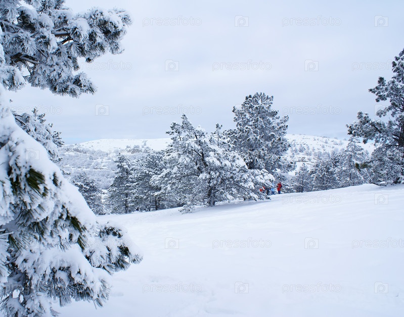 Прекрасный зимний пейзаж с соснами после снежной бури