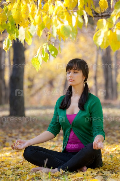 Молодая девушка, сидящая в позе лотоса на осенних листьх