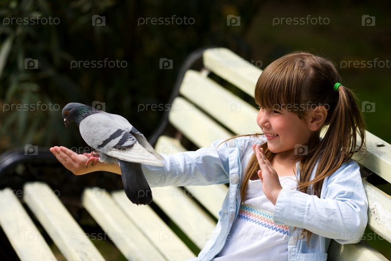 Девочка в парке кормит с руки голубя