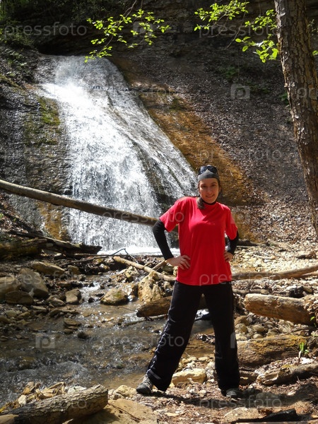Девушка стоит на фоне горного водопада