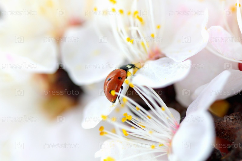 Божья коровка на белых цветах
