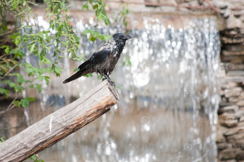 Ворон сидит на бревне на фоне водопада