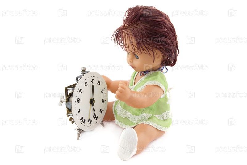 Кукла ремонтирует старый будильник на белом фоне