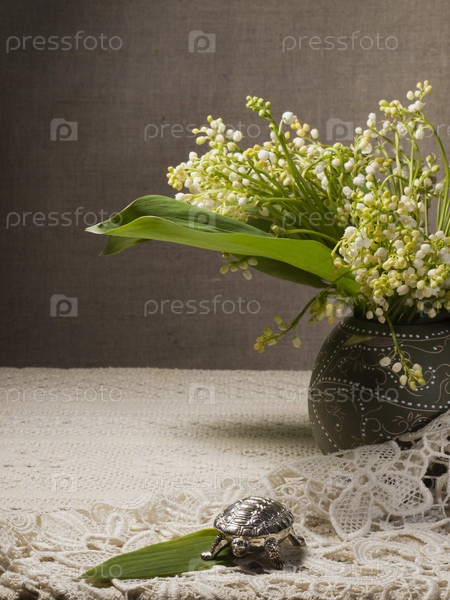Ландыши в вазе на фоне холста