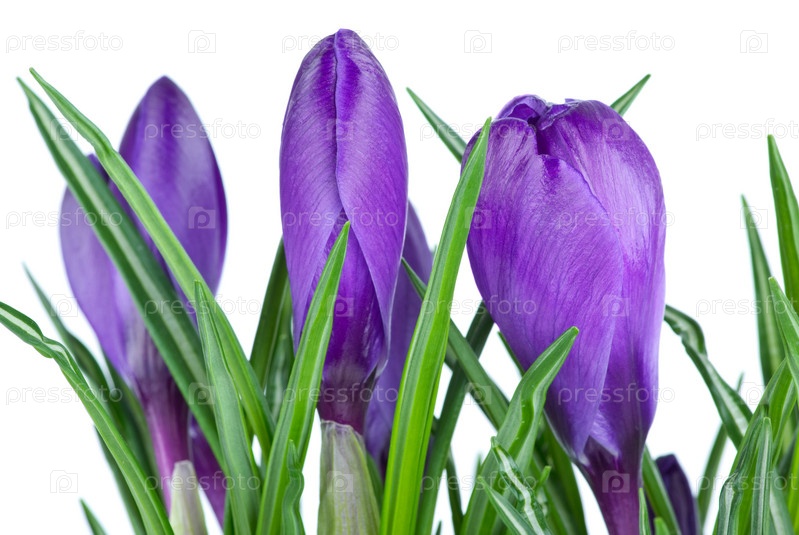 Бутоны фиолетовых крокусов на белом фоне