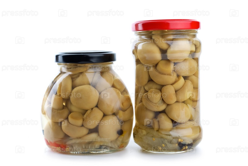 Две стеклянные банки с маринованными шампиньонами на белом фоне