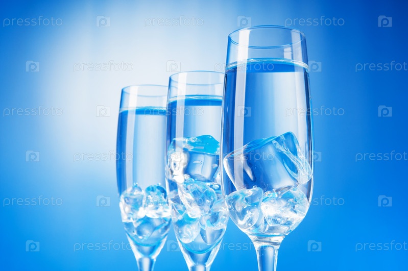 Бокалы со льдом в воде на голубом фоне