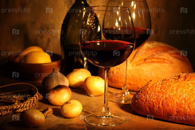 Бокалы с красным вином, репчатый лук и свежий хлеб. Натюрморт