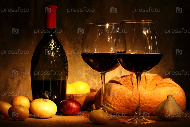 Бокалы с красным вином, репчатый лук и буханка хлеба. Натюрморт