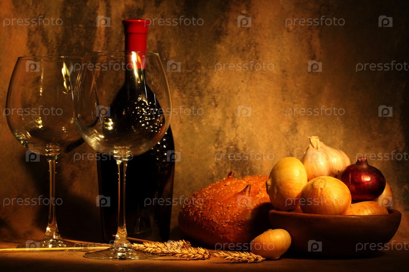Два пустых бокала, бутылка вина, репчатый лук и буханка хлеба