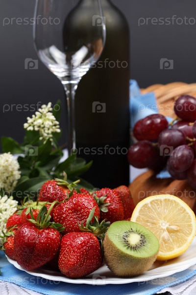 Тарелка с фруктами, вино и свежий хлеб. Натюрморт