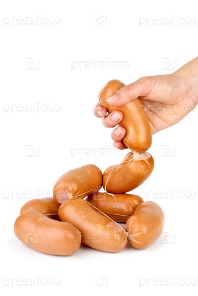 Рука берет (держит, укладывает) сардельки. Белый фон