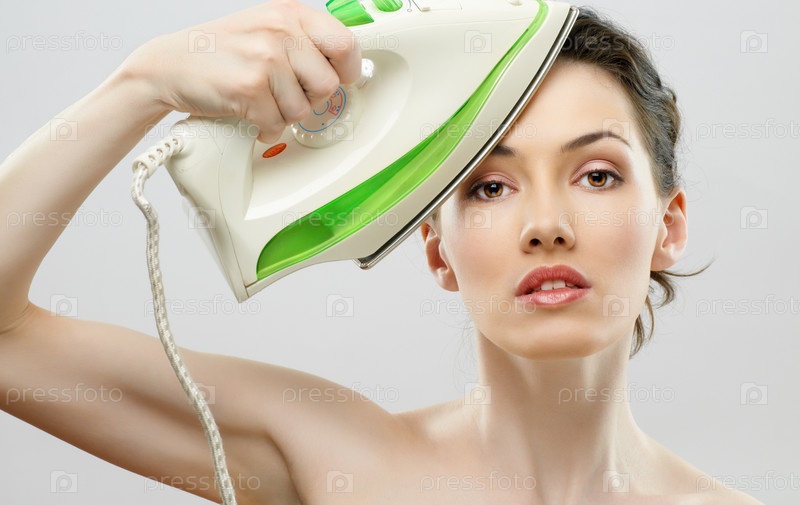 Девушка разглаживает кожу на лице утюгом