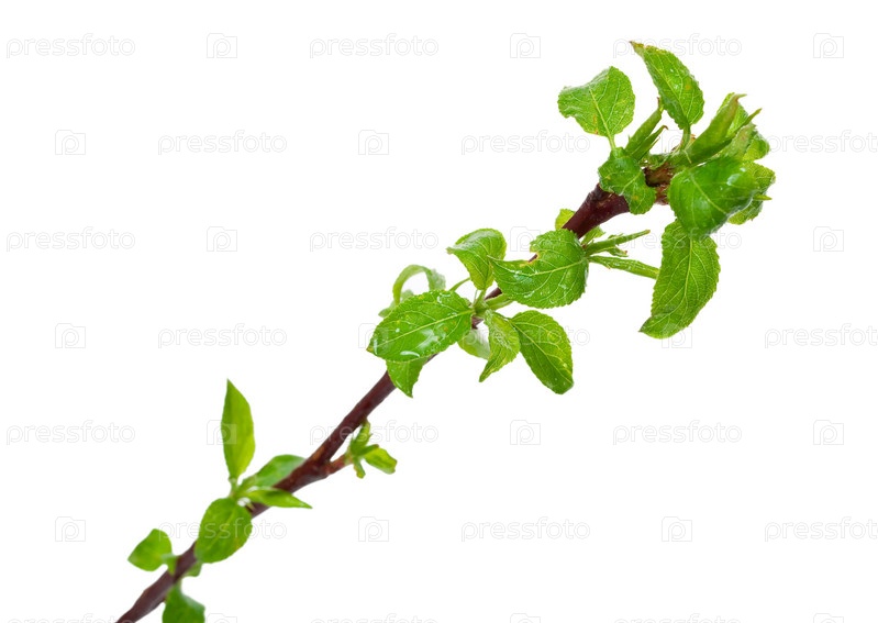 Ветка яблони с молодыми листочками на белом фоне