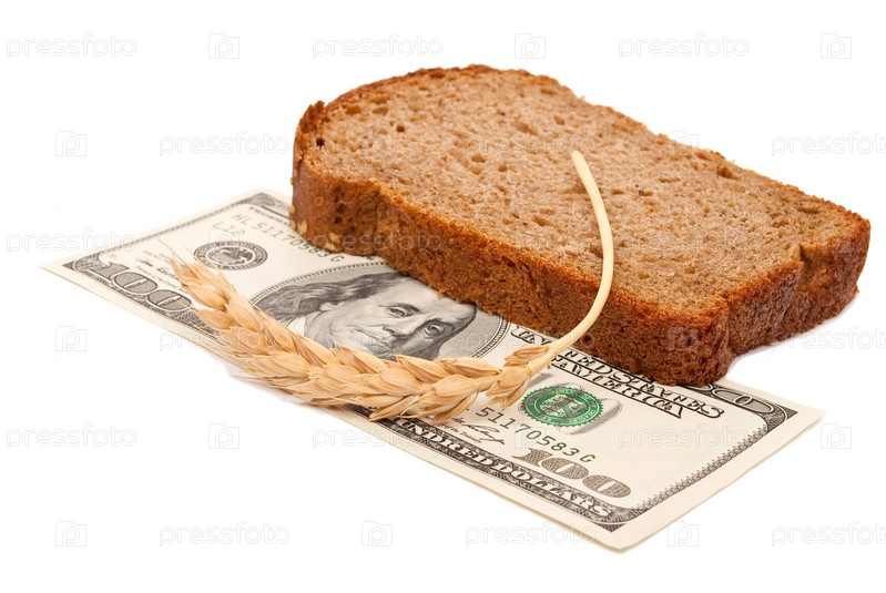 Кусок хлеба, лежащий на американских деньгах на белом фоне
