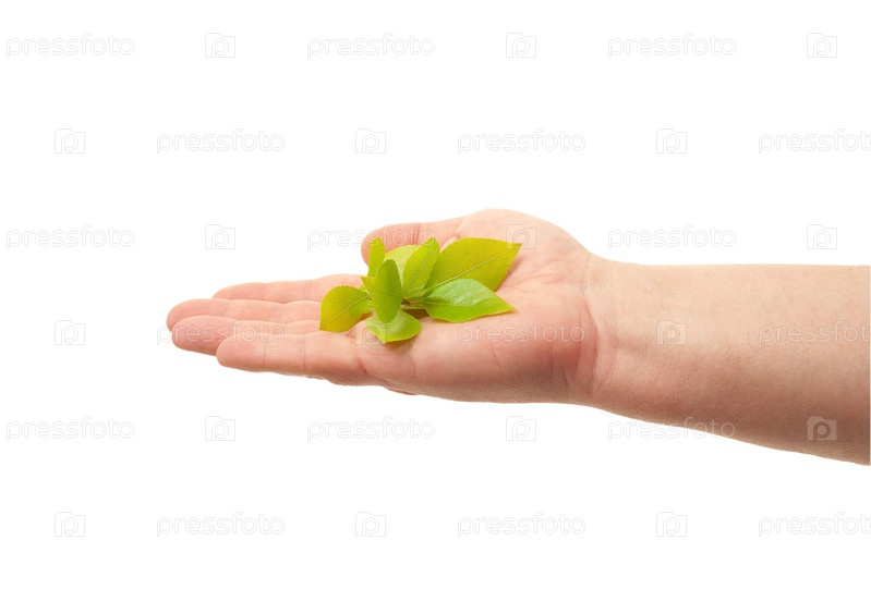 Зеленый росток в руке на белом фоне