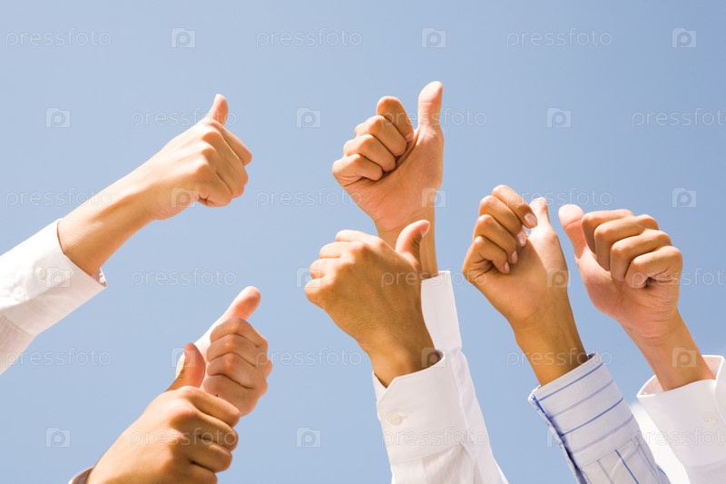 Изображение нескольких человеческих рук, показывающих большие пальцы на ясном голубом небе