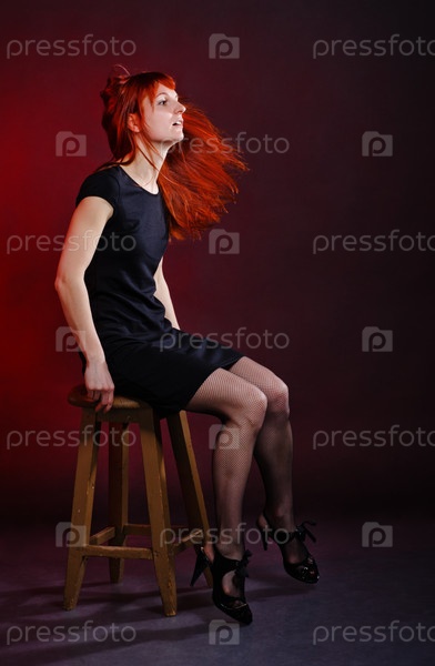 Женщина с длинными рыжими волосами сидит на стуле