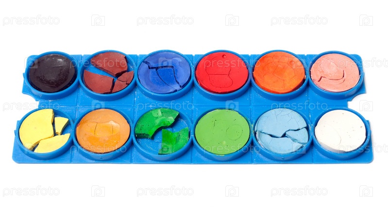 Стареющая пластиковая палитра с акварельной краской на белом фоне