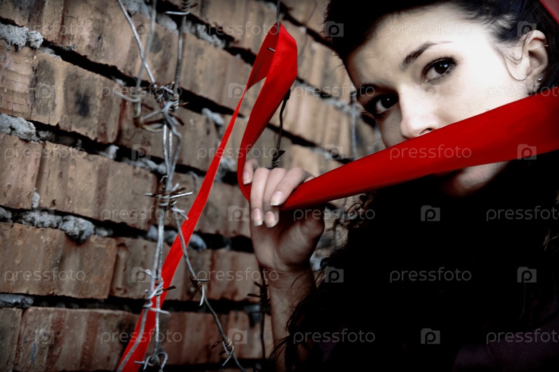 Девушка с красной лентой на открытом воздухе